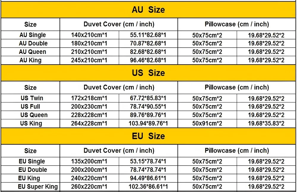 US Twin 173*218cm and Single Size only with 1piece Pillow Shame ,please Contact me if you need 2pieces